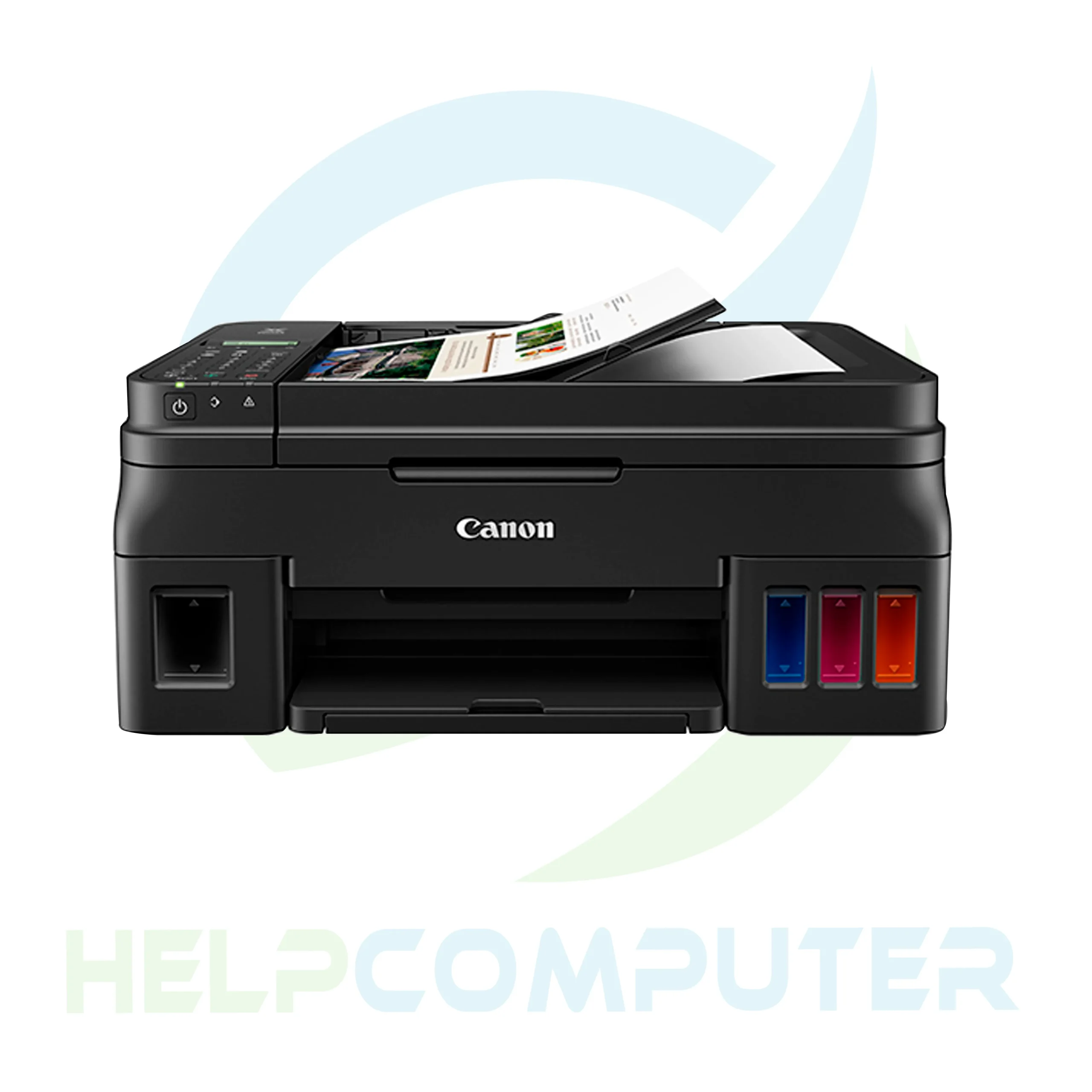 La impresora inalámbrica7 multifuncional PIXMA G4110 proporciona la capacidad de imprimir, copiar, escanear y enviar fax. Así mismo, tiene un alimentador automático de documentos de 20 hojas y una pantalla LCD de 2 líneas. Esta impresora también proporciona muchas de las funciones populares que se encuentran en los modelos anteriores tal como el sistema de tinta híbrido integrado, diseño compacto y capacidades de impresión sin bordes.12